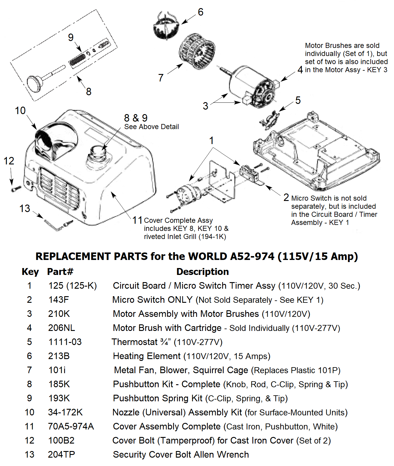 You could buy an entirely new unit to replace your current WORLD A52-974 (110V/120V - 15 Amp) hand dryer. But with the correct replacement parts, you can keep your hand dryer in working condition at a fraction of the cost of replacing the entire unit.