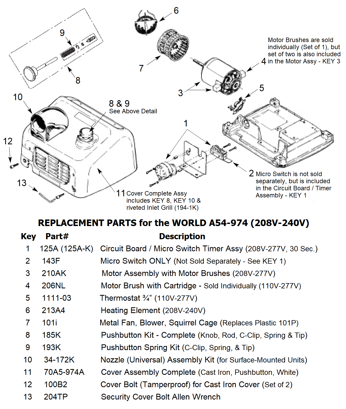 You could buy an entirely new unit to replace your current WORLD A54-974 (208V-240V) hand dryer. But with the correct replacement parts, you can keep your hand dryer in working condition at a fraction of the cost of replacing the entire unit.