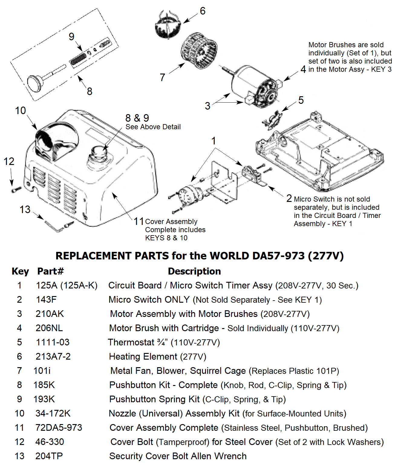 You could buy an entirely new unit to replace your current WORLD DA57-973 (277V) hand dryer. But with the correct replacement parts, you can keep your hand dryer in working condition at a fraction of the cost of replacing the entire unit.