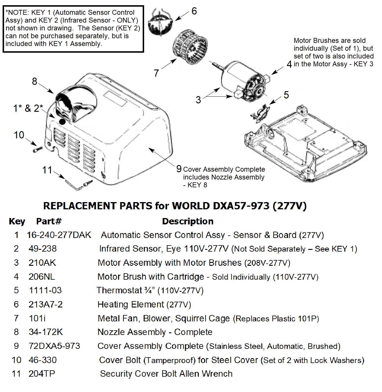 You could buy an entirely new unit to replace your current WORLD DXA57-973 (277V) hand dryer. But with the correct replacement parts, you can keep your hand dryer in working condition at a fraction of the cost of replacing the entire unit.
