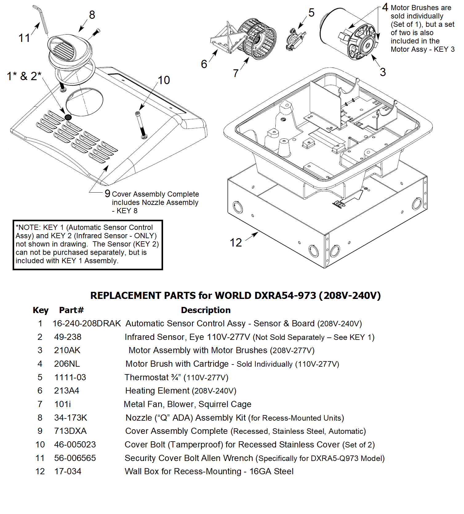 You could buy an entirely new unit to replace your current WORLD DXRA54-Q973 (208V-240V) hand dryer. But with the correct replacement parts, you can keep your hand dryer in working condition at a fraction of the cost of replacing the entire unit.