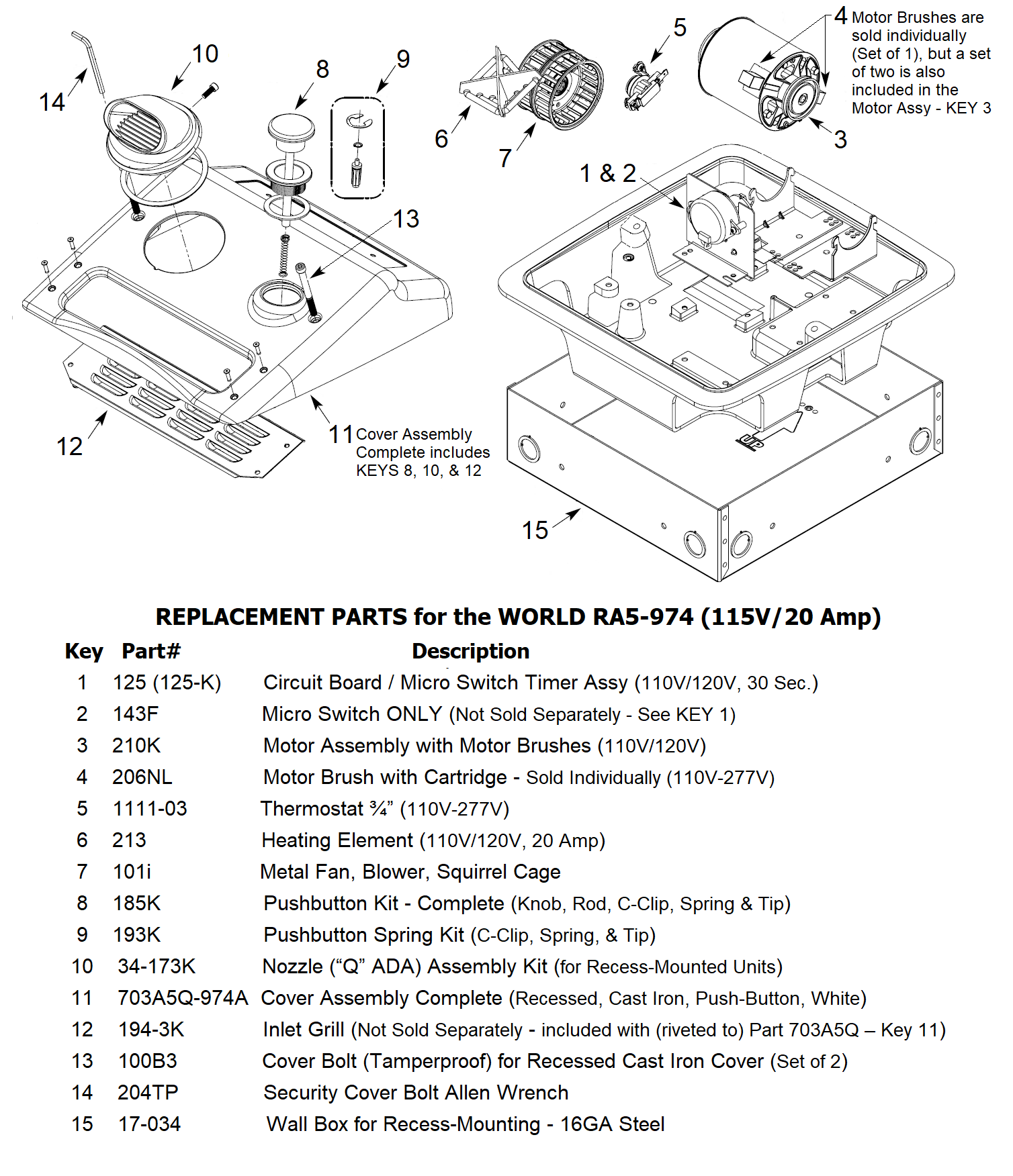 You could buy an entirely new unit to replace your current WORLD RA5-Q974 (110V/120V - 20 Amp) hand dryer. But with the correct replacement parts, you can keep your hand dryer in working condition at a fraction of the cost of replacing the entire unit.