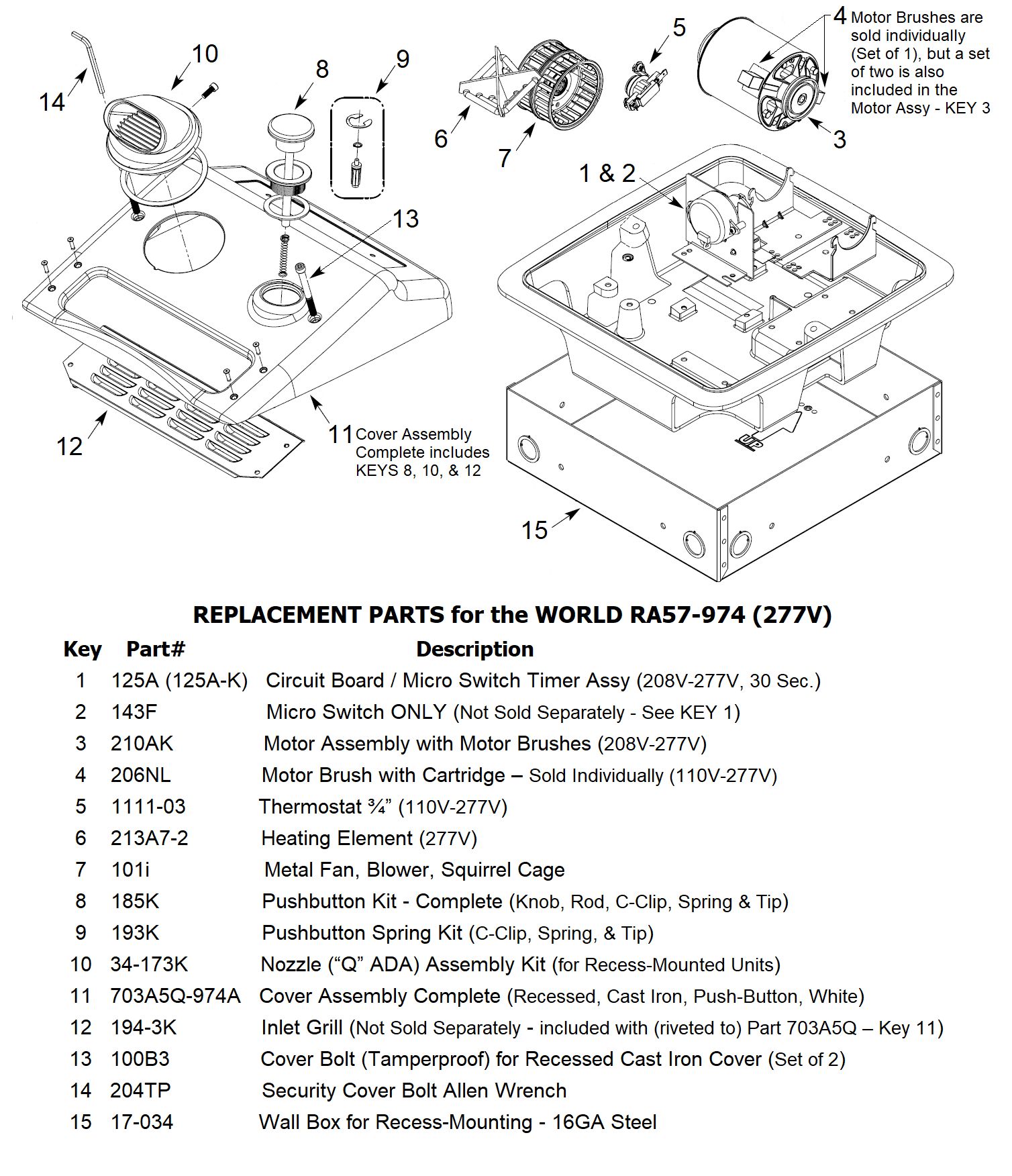 You could buy an entirely new unit to replace your current WORLD RA57-Q974 (277V) hand dryer. But with the correct replacement parts, you can keep your hand dryer in working condition at a fraction of the cost of replacing the entire unit.