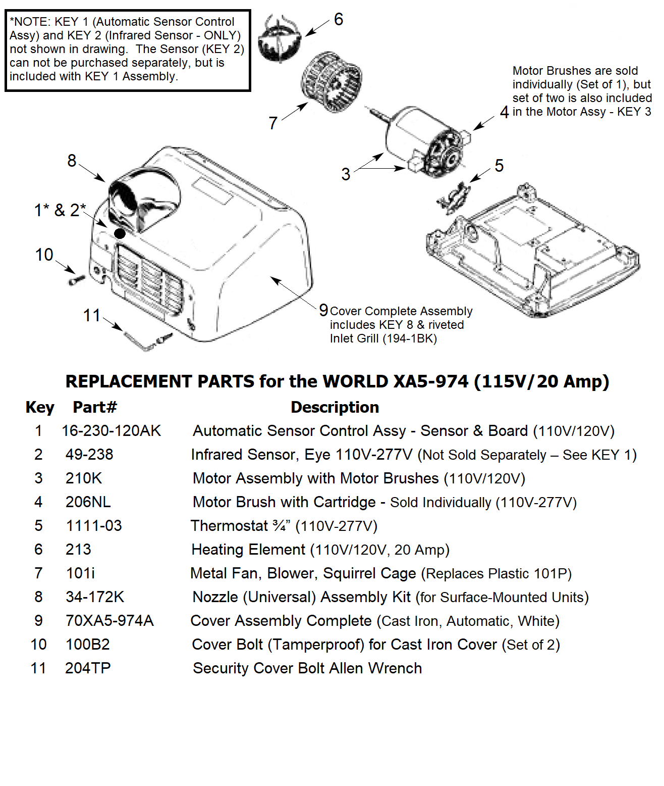 You could buy an entirely new unit to replace your current WORLD XA5-974 (110V/120V - 20 Amp) hand dryer. But with the correct replacement parts, you can keep your hand dryer in working condition at a fraction of the cost of replacing the entire unit.