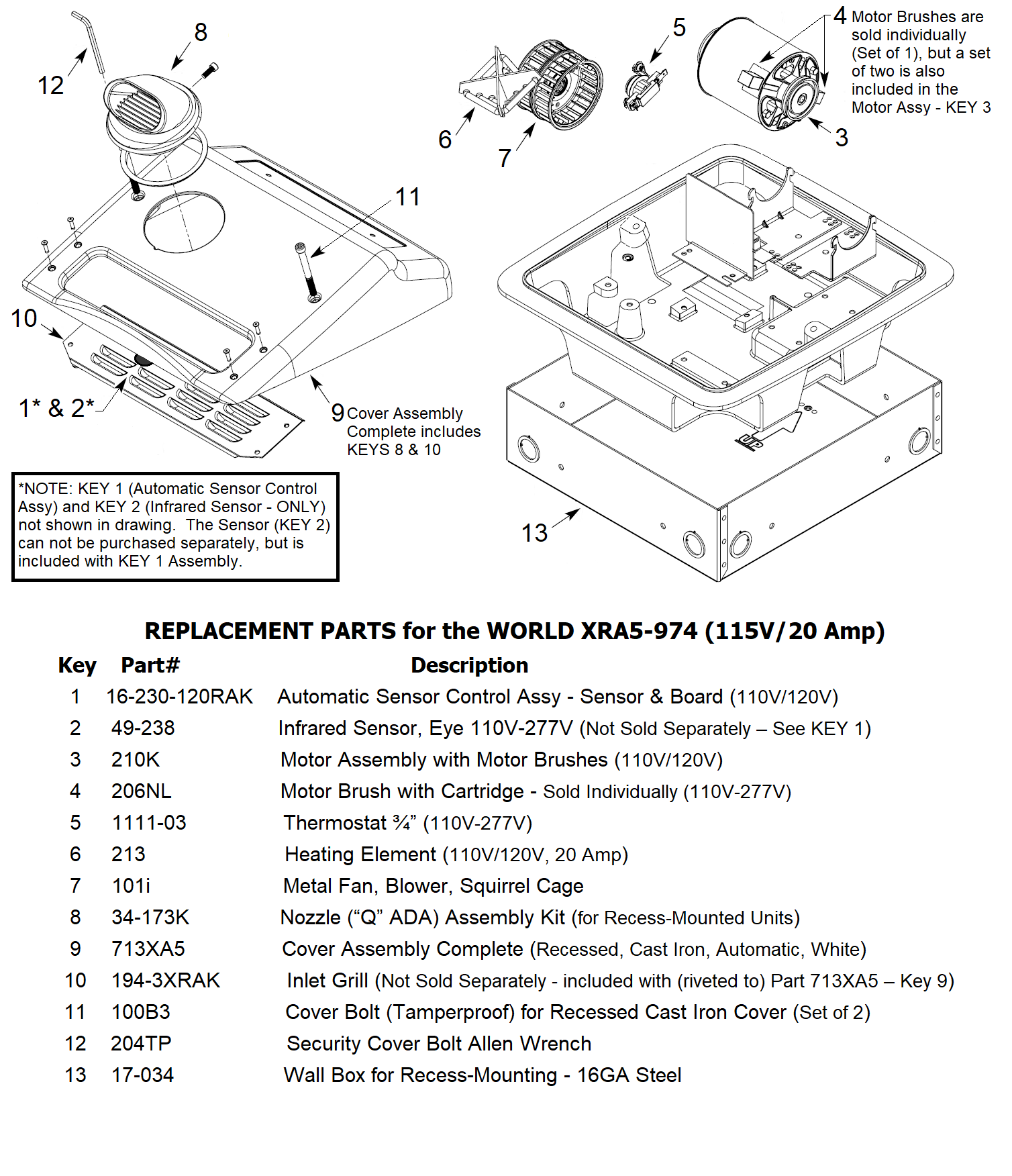 You could buy an entirely new unit to replace your current WORLD XRA5-Q974 (110V/120V - 20 Amp) hand dryer. But with the correct replacement parts, you can keep your hand dryer in working condition at a fraction of the cost of replacing the entire unit.